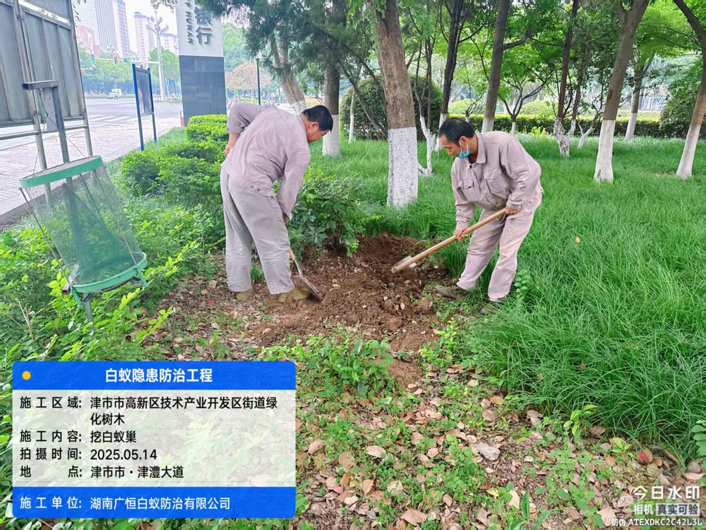 市园林处聘请专业技术人员对全市范围内乔木进行了仔细勘查,拟定了综合治理方案,采用对人体无害且不污染环境的药剂,通过对树根树干部位喷施药剂、放置诱杀点、挖巢灭蚁等方法进行综合防治。5月中上旬开始,对高新区、津澧大道、大同路、襄窑路、九澧广场等地乔木开展了白蚁治理工作,涉及乔木约1500余株。