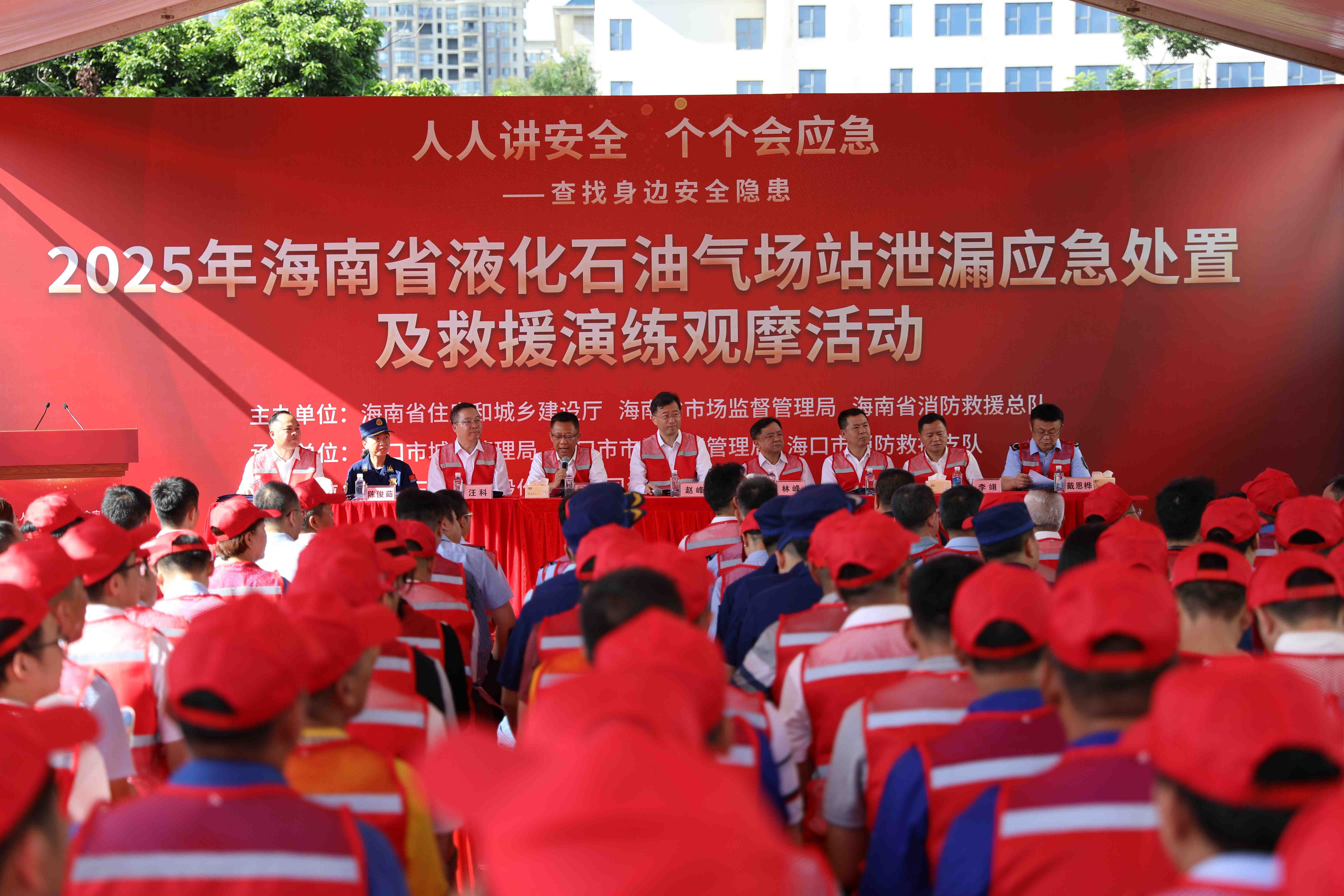 为贯彻落实习近平总书记关于城镇燃气安全生产重要批示指示精神,按照全国“安全生产月”活动部署,认真落实“人人讲安全、个个会应急—查找身边安全隐患”主题要求,全面提升燃气行业突发事件应急处置能力,6月24日,省住房城乡建设厅、省市场监督管理局、省消防救援总队在海口金盘供气站联合举办“2025年海南省液化石油气场站泄漏应急处置及救援演练观摩活动”。此次观摩活动由海口市城市管理局、海口市市场监督管理局、海口市消防救援支队承办,中国石化销售股份有限公司海南石油分公司具体实施。
