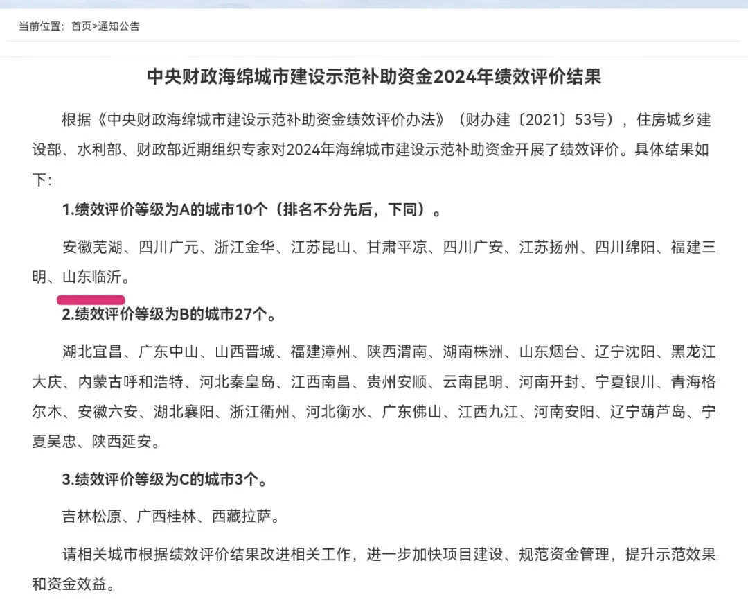 6月30日,中央财政海绵城市建设示范补助资金2024年绩效评价结果公布。继2023年度获评山东省首个A等级后,2024年度临沂市再次被评为A等级。